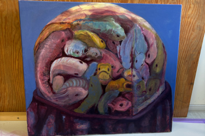Tijdens een gesprek met Yuliia deelde ze haar proces en ideeën tijdens haar verblijf bij De Pionier. Nog voordat ze naar haar studio verhuisde, droomde ze over een aquarium vol vissen die voorzichtig tegen het glas zwommen. Toen ze haar nieuwe werkruimte zag, een studio met veel ramen, moest ze meteen aan die droom denken. Dit inspireerde haar om papieren vissen te knippen en ze op de ramen te plaatsen. "Inmiddels voelt mijn studio, met al die ramen, als het aquarium waar ik over droomde."